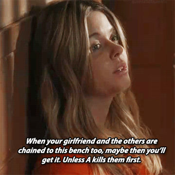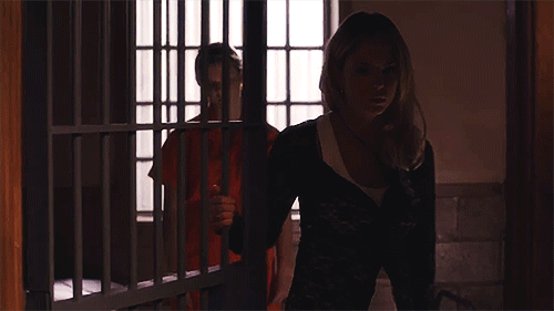Let’s jump right in with one of the old relationships,Toby and Alison. Toby conveniently drops off paperwork for Tanner at the Chester Women’s Correctional Facility. While there he sees Alison “Fresh Meat” Dilaurentis sporting her new to prison bruises. Ali may not be A, but I for one was so happy that she is finally getting some payback. After she tries to guilt Toby about how he should have empathy for what she is going through, he reminds her that she was the one who lied to have him put behind bars. Score for Officer Toby!