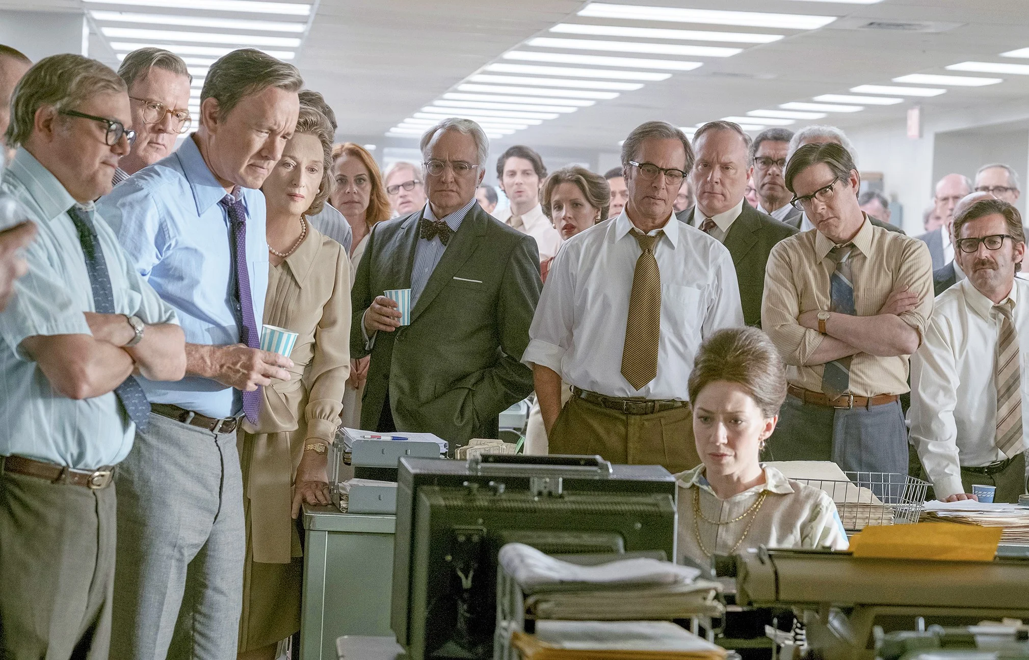 Spielberg uses plenty of one takes to draw us into the tension. He gives a master class in how to keep the camera rolling through a long scene without cutting away, but instead allowing the camera to focus on what’s important. He moves out of a closeup with one character, into a two-shot with another, and then to a wide with effortless ease. It’s also evident that Spielberg respects the process and importance of the printing press in the era. He takes moments to show letters being arranged for printing, and groups of people running to the paper to consume information that we take for granted receiving these days in an instant on our cell phones.